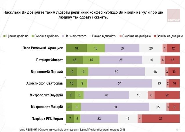 "Слід зазначити, що окремі церковні діячі користуються повагою серед парафіян інших конфесій. Так, папа Франциск, попри високий рівень довіри серед греко-католиків, має високий рівень довіри також і серед парафіян УПЦ КП. До патріарха Філарета позитивно ставляться як прихильники УПЦ КП, так і УГКЦ. Подібне ставлення і до Варфоломія. Архієпископ Святослав користується відносно високим рівнем довіри серед парафіян УПЦ КП, митрополит Макарій – серед УПЦ КП та УГКЦ. Натомість митрополит Онуфрій та патріарх Кирило користуються відносно вищим рівнем довіри виключно серед парафіян УПЦ МП", – зазначили соціологи.