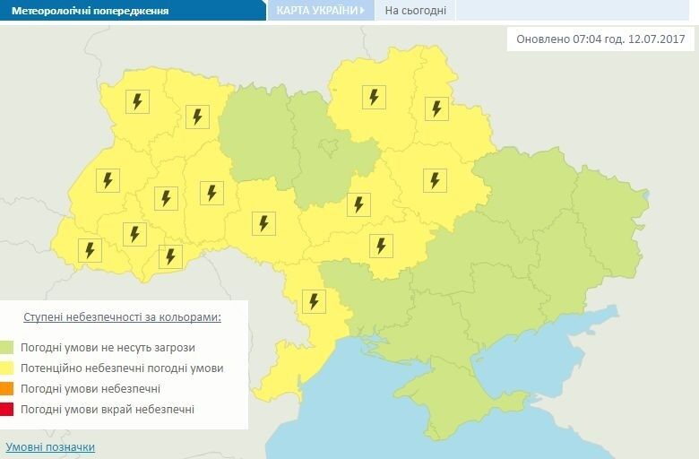 "Удень 12 липня в Рівненській, Волинській, Львівській, Тернопільській, Хмельницькій, Івано-Франківській, Закарпатській, Чернівецькій, Вінницькій, Черкаській, Кіровоградській, Полтавській, Одеській, Чернігівській та Сумській областях грози, в окремих районах град та шквали 15–20 м/с", – зазначають у відомстві.