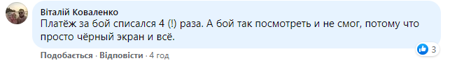 Користувач Віталій Коваленко зазначив, що у нього сервіс чотири рази списав гроші, але так і не ввімкнув трансляції бою.