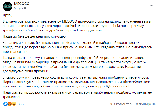 Деякі користувачі медіасервісу Megogo не змогли подивитися трансляцію поєдинку боксерів Олександра Усика та Ентоні Джошуа, хоча заплатили за перегляд. Свої скарги користувачі залишають у коментарях до останніх постів сервісу в соцмережах.