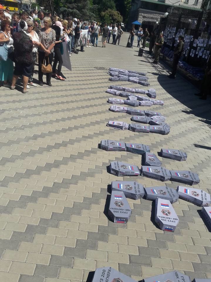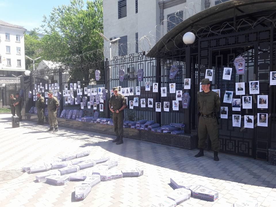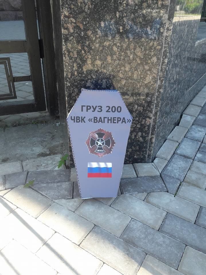 Активісти принесли до воріт дипмісії символічні картонні труни з написом "Вантаж 200. ПВК "Вагнера". Їх поклали на землю, прикріпили до воріт. Картонними трунами виклали написи "ИхТамНет".
