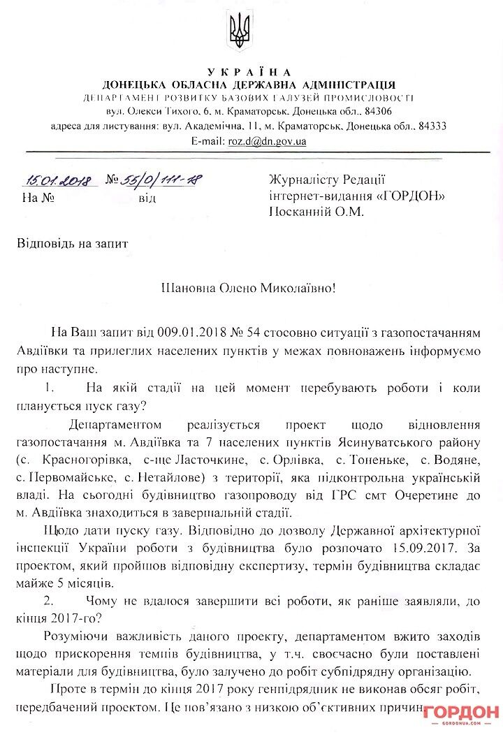 На сьогодні подавання газу в Авдіївку Донецької області не відновлено. На трубопроводі проходять випробування. Завершення будівництва об'єкта до початку 2018 року не видавалося можливим: роботи розпочалися у вересні 2017 року, а за проектом термін їх виконання становить приблизно п'ять місяців, тобто до середини лютого. Про це йдеться у відповіді департаменту розвитку базових галузей промисловості Донецької обласної державної адміністрації на запит видання "ГОРДОН".