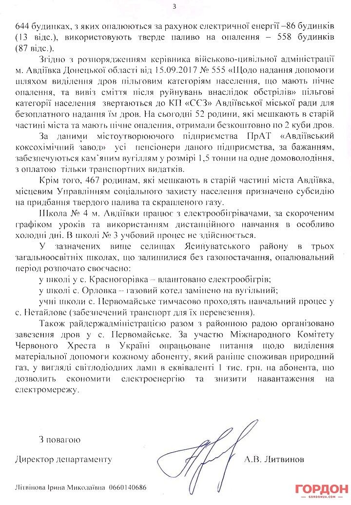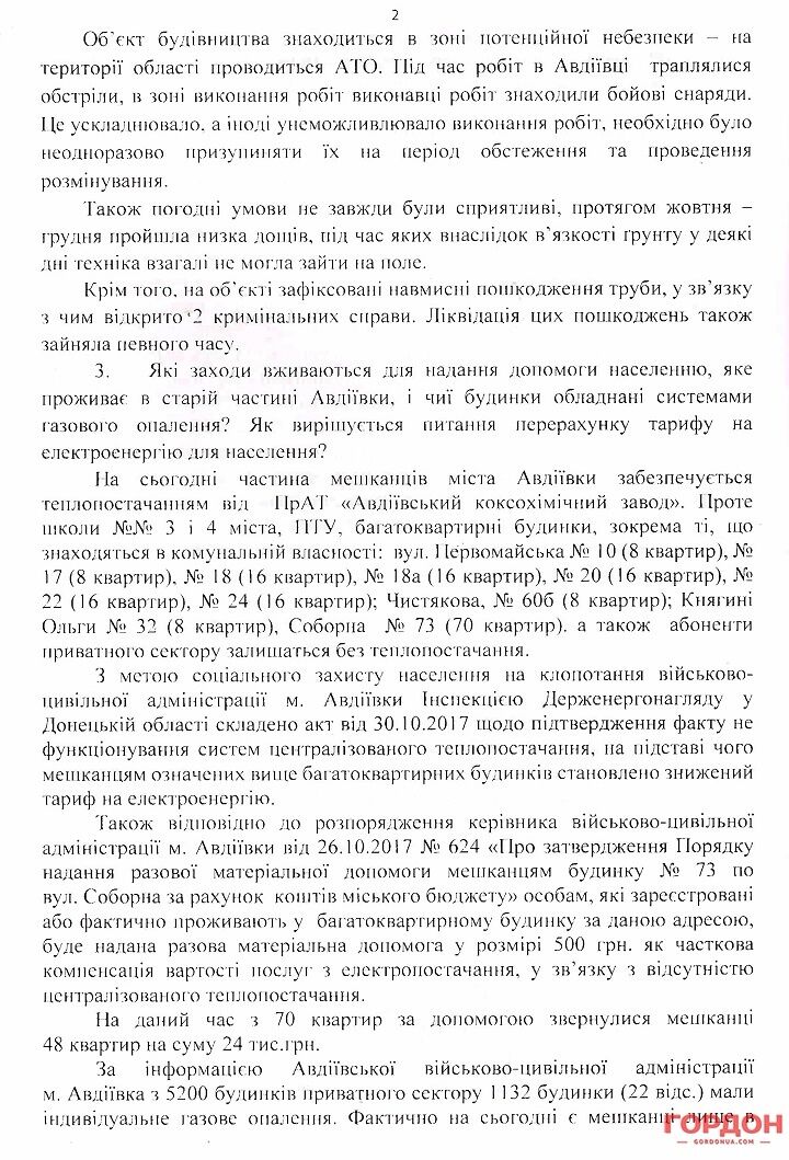 "На сьогодні будівництво газопроводу від селища Очеретине до міста Авдіївки на завершальній стадії. Згідно з дозволом Державної архітектурної інспекції України роботи з будівництва було розпочато 15 вересня 2017 року. За проектом, який пройшов відповідну експертизу, термін будівництва становить майже п'ять місяців", – ідеться в листі.