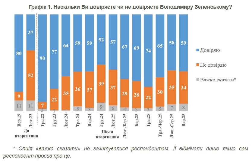 Порівняно з попереднім соціологічним дослідженням, яке проводили в липні – серпні, рівень довіри до Зеленського зріс на один відсотковий пункт і на стільки само зменшився рівень недовіри.