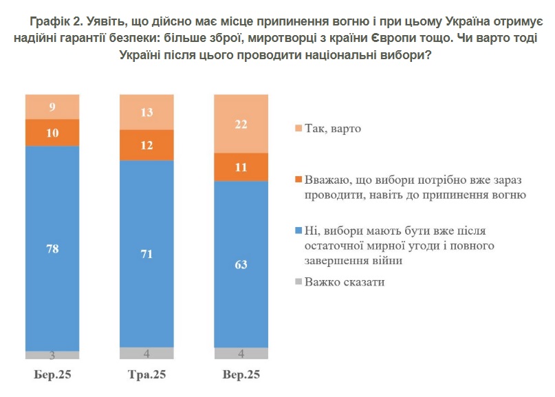 Більшість – 63% – вважає, що вибори потрібно провести вже після остаточної мирної угоди й повного завершення війни.