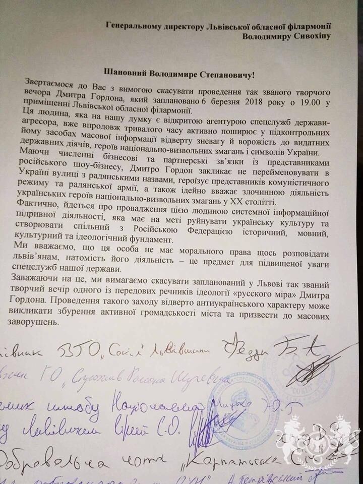 27 лютого представники націоналістичних організацій Львова (серед яких "Сокіл", "Правий сектор", добровольчий рух ОУН і громадянський корпус "Азов") передали керівництву Львівської обласної філармонії письмове звернення з вимогою скасувати захід, оскільки у Гордона "немає морального права щось розповідати львів'янам".