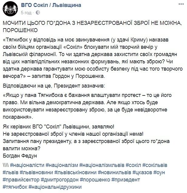 Після прес-конференції президента лідер львівського "Соколу" Богдан Федун написав у Facebook: "Як керівник ГО "Сокіл" Львівщини заявляю: незареєстрованої зброї у членів нашої організації нема! Запитання пану президенту: а із зареєстрованої зброї цього го...дона валити можна?"
