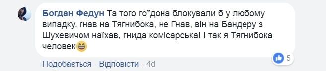 "Того го...дона блокували б у любому випадку – гнав би на Тягнибока, не гнав. Він на Бандеру з Шухевичем наїхав, гнида комісарська! І так, я Тягнибока человек", – зазначив Федун.