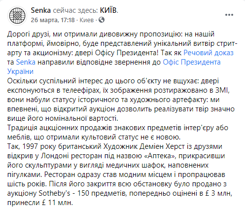 На сторінці у Facebook SENKA.market 26 березня з'явилася інформація про можливе проведення онлайн-аукціону, на якому продадуть двері з ОПУ.