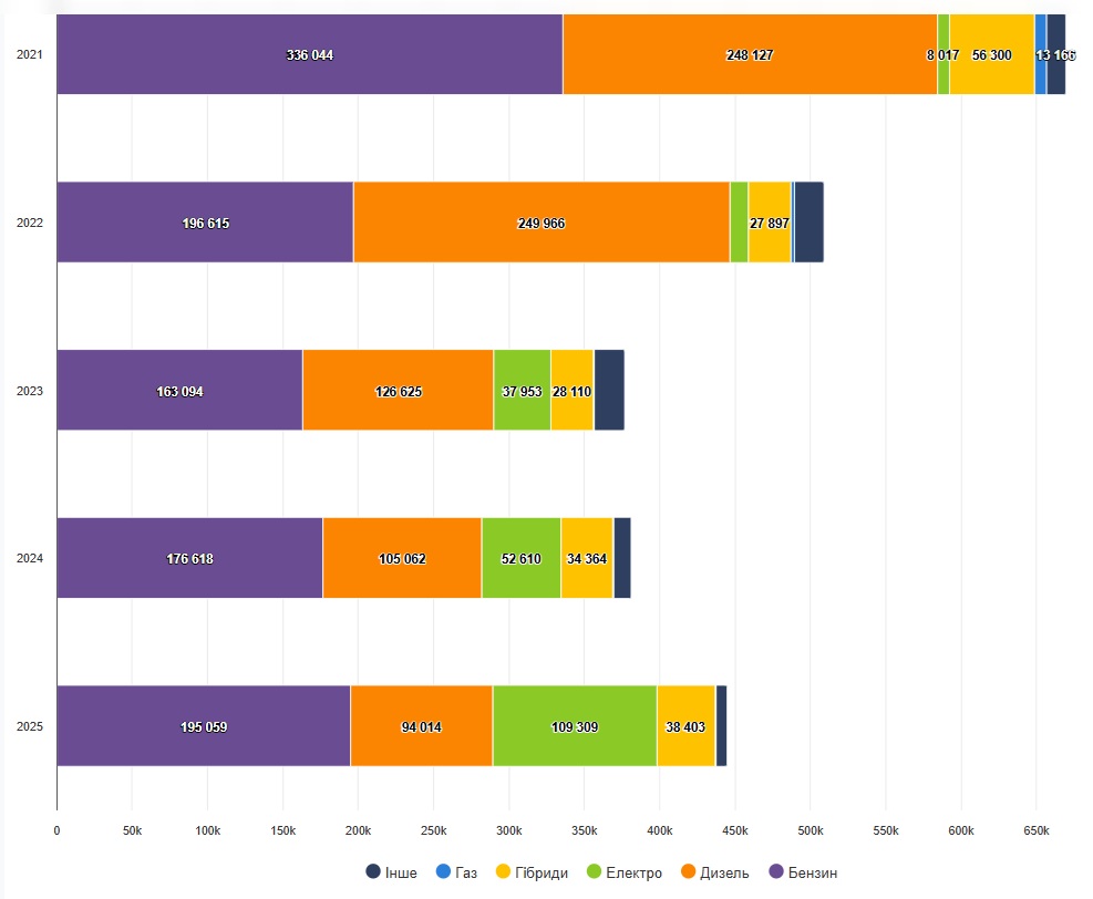 "444 860 транспортних засобів імпортували в Україну торік. Це на 17% більше, ніж у 2024-му, проте все ще на третину менше, ніж у 2021 році [до початку повномасштабного вторгнення Росії]", – ідеться в повідомленні.