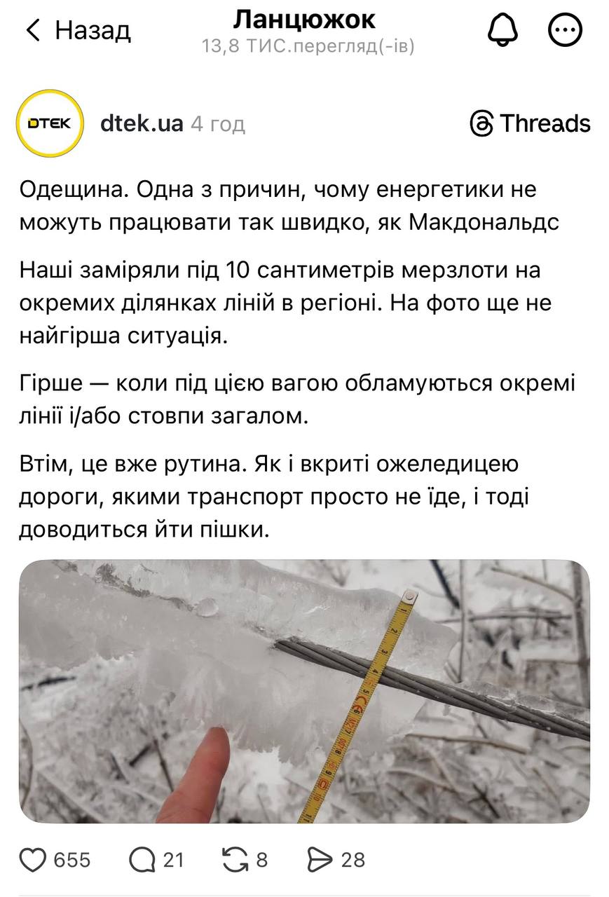 "Гірше, коли під цією вагою обламуються окремі лінії і/або стовпи загалом. Утім, це вже рутина", – ідеться в повідомленні.