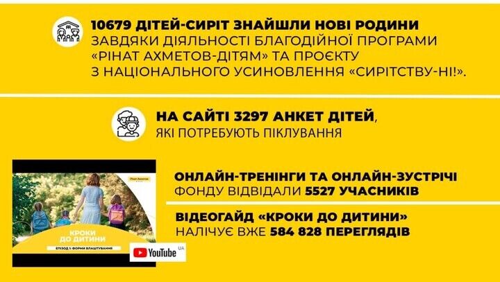 Програма "Рінат Ахметов Дітям. Сирітству – ні!" створила серію відеороликів "Кроки до дитини". Відеогайд містить головну інформацію щодо влаштування дитини в сім'ю або в дитячий будинок сімейного типу, а також досвід усиновлення українського ведучого Тімура Мірошниченка та його дружини Інни.