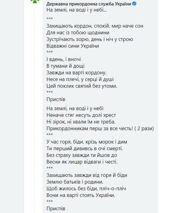 "Після того, як ми опублікували відео з першого проходження Хрещатиком наших парадних батальйонів, багато з вас питали про пісню, яку виконували прикордонники. Ми дуже раді, що вона вам так припала до душі, тому ловіть текст у коментарі", – написали у пресслужбі.