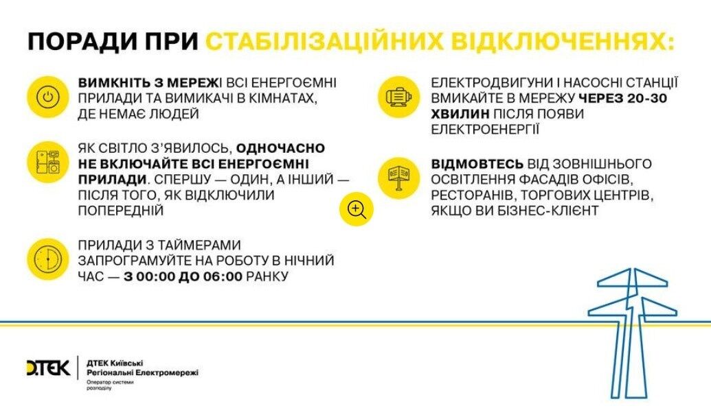 Також користувачам порадили правильно вмикати електроприлади після стабілізаційного вимкнення, щоб запобігти одночасному значному збільшенню навантаження й аварії на електромережах.