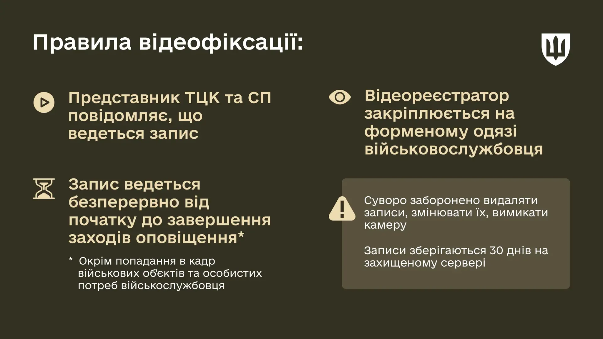 "Уповноважені представники ТЦК або поліцейські мають право здійснювати фото- й відеофіксацію під час пред'явлення й перевірки документів, вручення повісток чи інших адміністративних процедур", – ідеться в повідомленні.