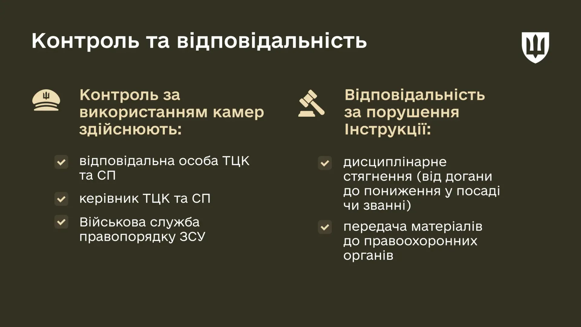 За порушення правил використання технічних засобів фіксації передбачена догана з пониженням у посаді чи званні, а також передання матеріалів до правоохоронних органів, повідомили в міністерстві.