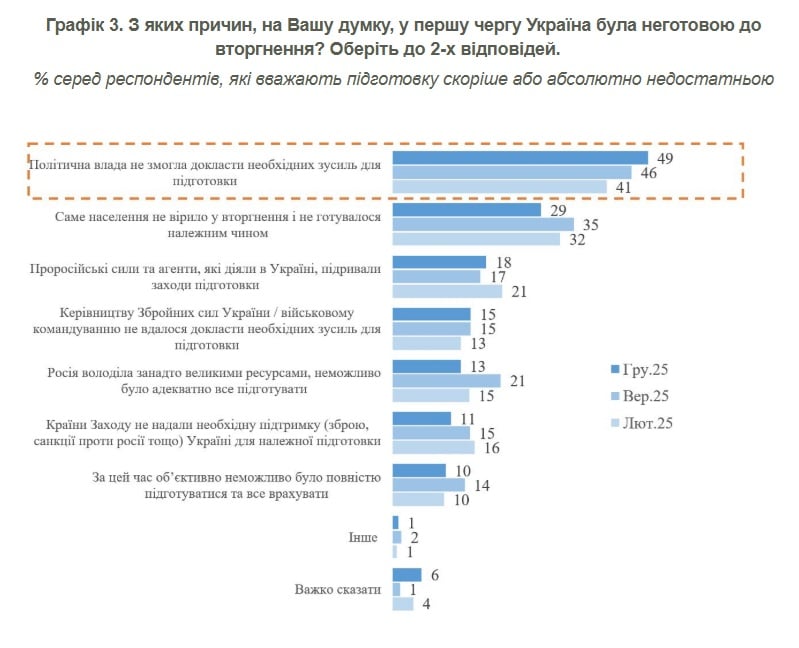 Респондентам поставили запитання, з яких причин, на їхню думку, Україна була не готовою до вторгнення. Опитувані могли назвати два варіанти.