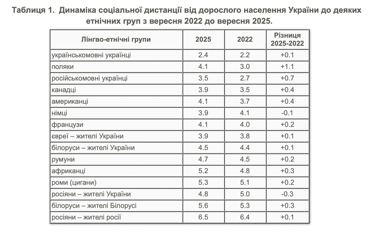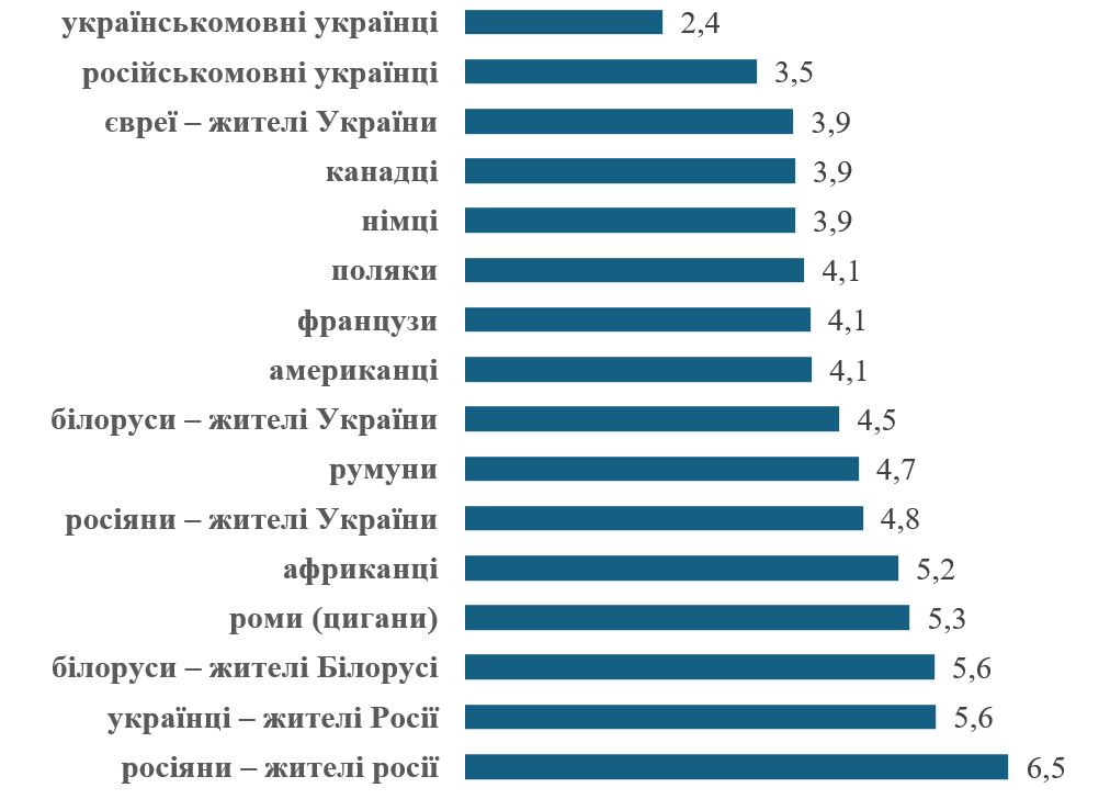 Наступну групу формують поляки, французи й американці (індекси приблизно 4,0–4,1), після яких ідуть білоруси – жителі України (4,5) і румуни (4,7). Вищий рівень соціальної дистанції фіксують щодо росіян – жителів України (4,8), африканців (5,2) і ромів (5,3).