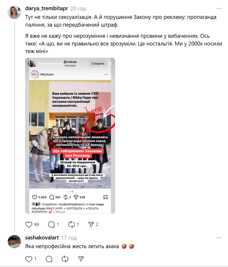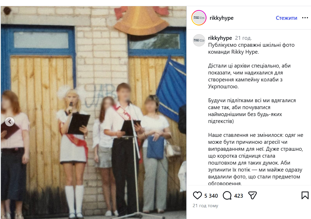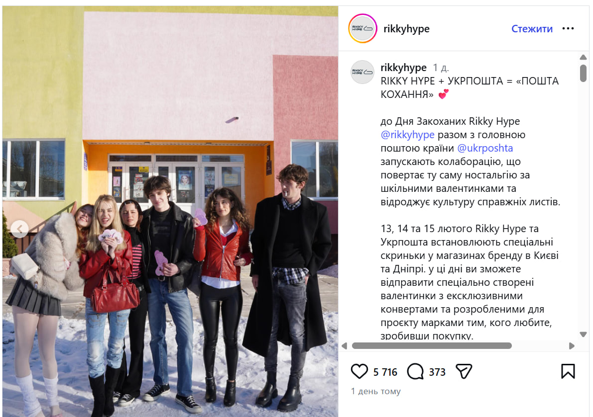 У зміненому дописі бренд Rikky Hype розмістив дещо інші знімки й пригадав, як колись школярі обмінювалися написаними від руки валентинками й заявив про спільний з "Укрпоштою" намір "відродити культуру справжніх листів". Для цього анонсували встановлення спеціальних поштових скриньок у магазинах бренду в Києві й Дніпрі.