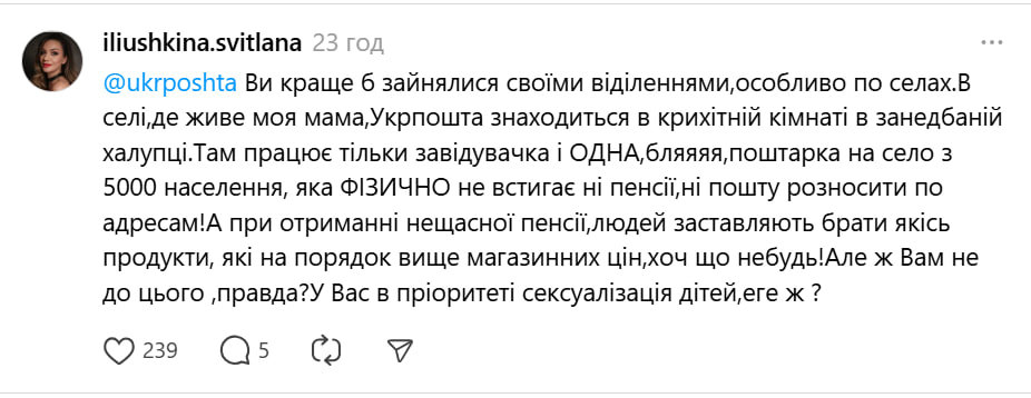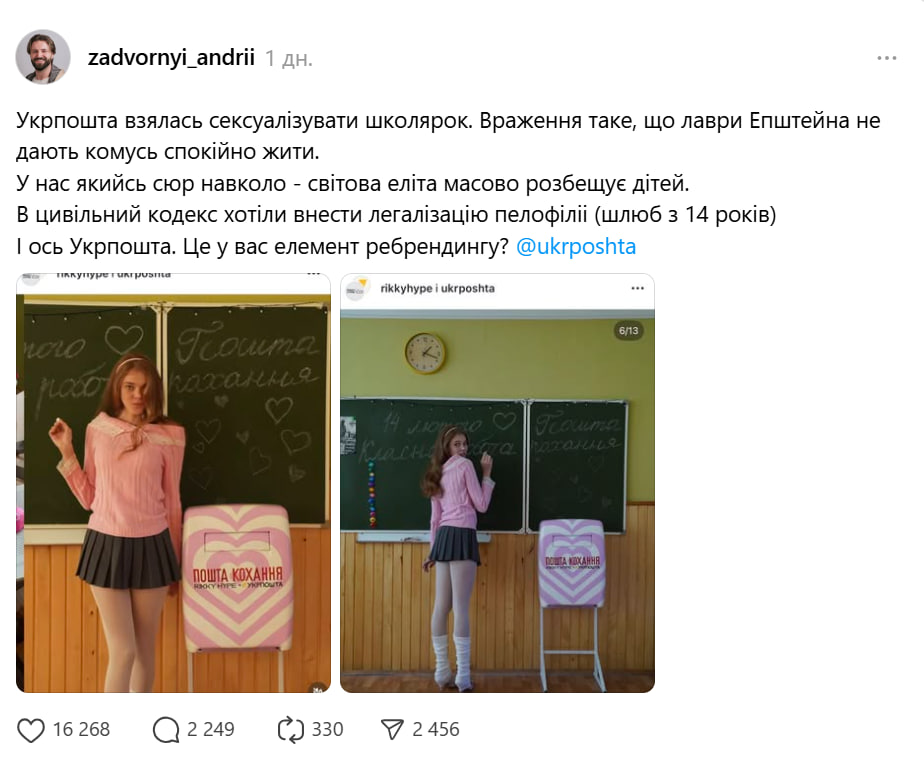 "Укрпошта" взялася сексуалізувати школярок. Враження таке, що лаври Епштейна не дають комусь спокійно жити. У нас якийсь сюр навколо – світова еліта масово розбещує дітей. У Цивільний кодекс хотіли внести легалізацію пелофілії (шлюб із 14 років). І ось "Укрпошта". Це у вас елемент ребрендингу?" – написав він.
