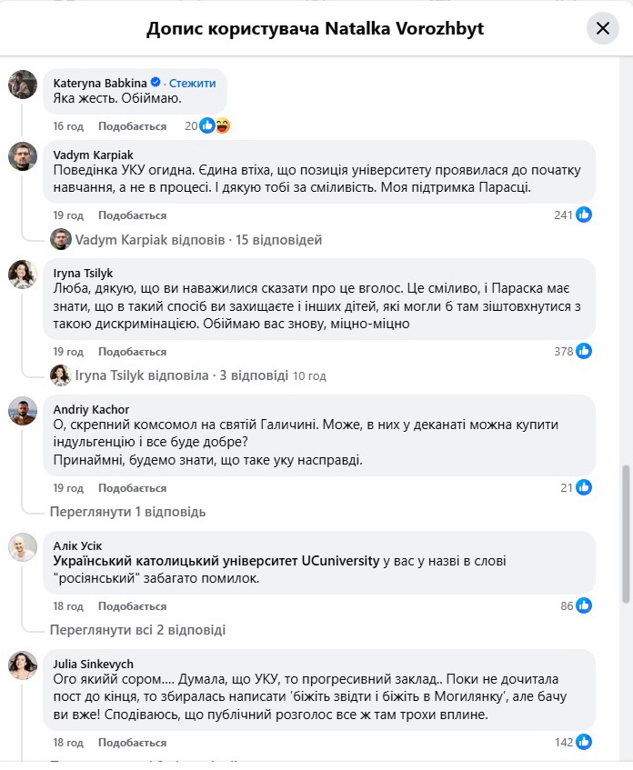 "Поведінка УКУ огидна. Єдина втіха, що позиція університету проявилася до початку навчання, а не у процесі", – підкреслив український журналіст Вадим Карп'як.