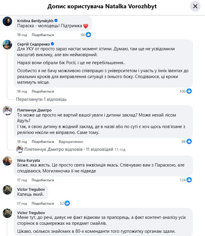 "Поки що у срачі навколо УКУ найцікавіше / найсмішніше – те, що розчаровані коментатори вважали його "прогресивним" і "толерантним". УКУ – це будь-що, але не ці дві речі. Це буквально найконсервативніший ВНЗ в Україні. І це при тому, що я закінчила там дві магістратури й ні про що не шкодую", – написала в соцмережі X випускниця університету, голова комунікацій медіа "Ґрунт" Меланія Подоляк.