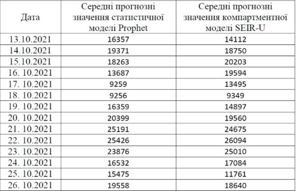 "На цьому тижні очікуються рекордні значення кількості нових захворювань, але цьому, ймовірно, завадять довгі вихідні, що традиційно призводять до зменшення кількості офіційних виявлень. Згідно з прогнозними обчисленнями (в яких закладено поточну тенденцію до збільшення кількості нових виявлень), середня кількість нових випадків дорівнюватиме 14 897 (SEIR_U), 14 650 (Prophet) протягом тижня 13–19 жовтня і 18 640 (SEIR_U), 20 922 (Prophet) – протягом тижня 20–26 жовтня 2021 року", – ідеться у звіті.