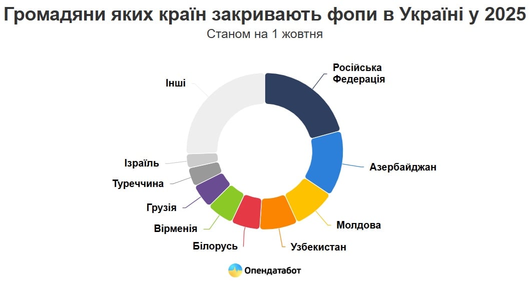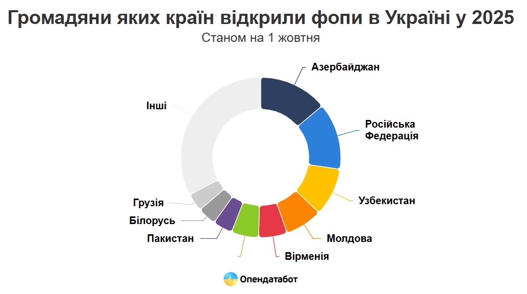 Найбільше іноземців, які відкрили ФОП, – з Азербайджану (229) і країни-агресора Росії (222). Також серед лідерів громадяни Узбекистану (160) й Молдови (125).