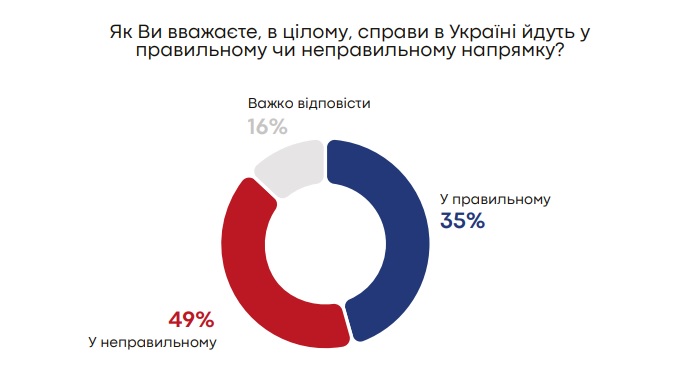 "Результати кількісного дослідження свідчать про зростання критичності в оцінках загальної ситуації: 49% опитаних вважають, що ситуація у країні розвивається в неправильному напрямі, тоді як 35% зазначають, що напрям є правильним", – ідеться в повідомленні.
