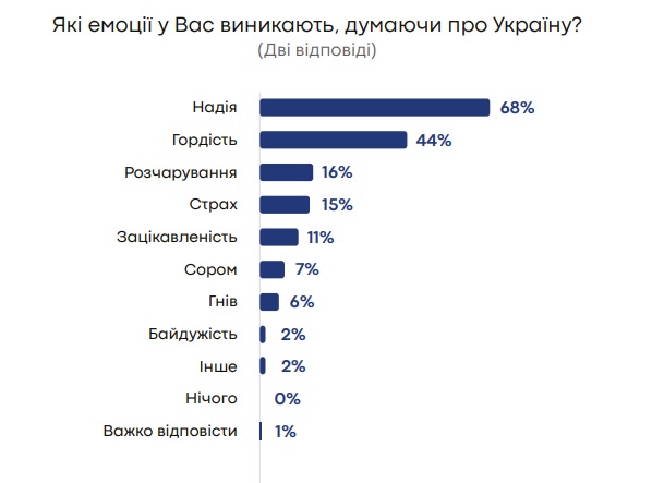 Згідно з результатами опитування, найбільше, думаючи про Україну, українці (68%) відчувають надію, а також гордість (44%). Варіантів відповідей можна було обрати два.