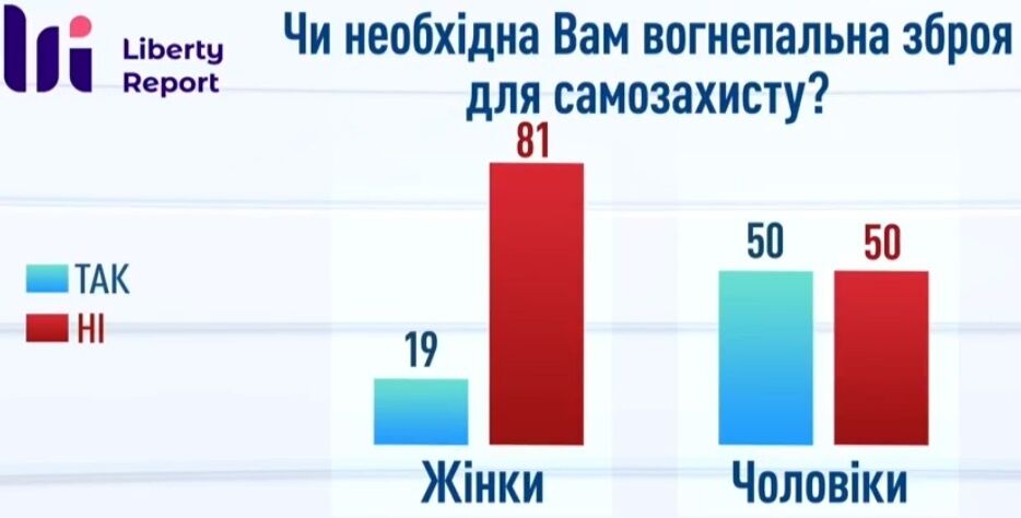 Опитування, проведене в Україні соціологічною компанією Liberty Report на замовлення студії Савіка Шустера, засвідчило, що чоловіки вдвічі частіше, ніж жінки, хотіли б мати вогнепальну зброю.