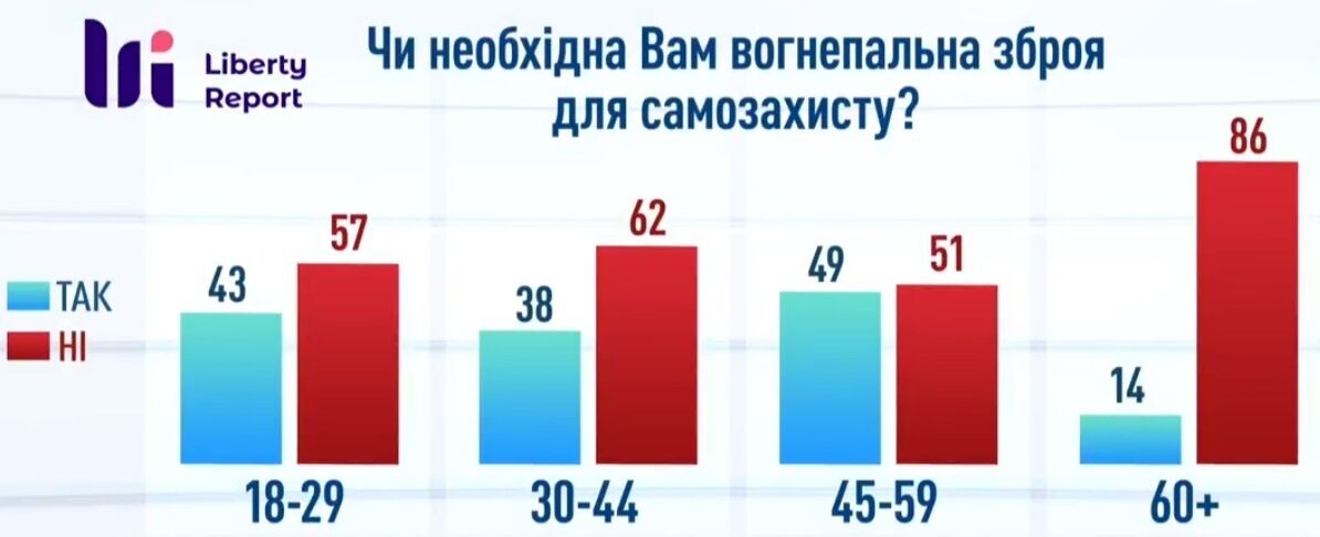 Найбільше прихильників володіння вогнепальною зброєю виявилося у віковій категорії 45–59 років – 49%, у категорії 60+ таких тільки 14%.