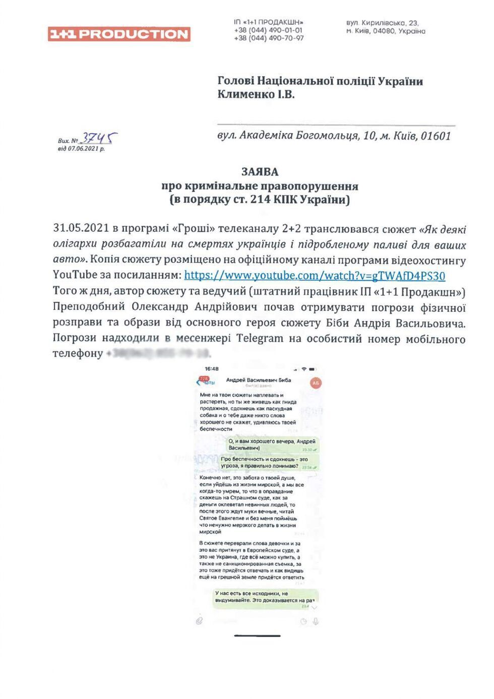 "Компанія переймається за здоров’я та життя співробітника, а також його близьких, і сприймає погрози від фігуранта сюжету як цілком реальні. Наразі компанія робить усе можливе для гарантування безпеки Олександра, проте ми сподіваємось на швидке вирішення ситуації з боку правоохоронних органів і просимо прийняти та розглянути заяву про кримінальне правопорушення ", – ідеться в заяві медіагрупи, яку опублікував "Детектор медіа".