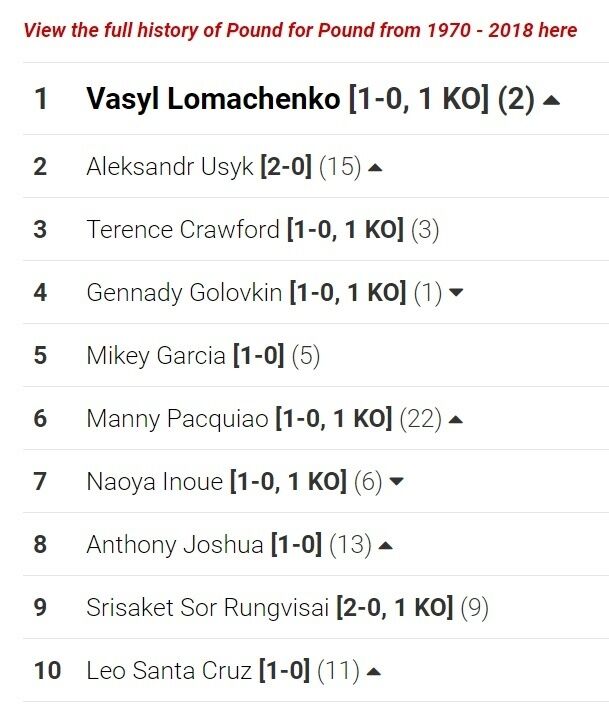 В оновленому рейтингу найкращих боксерів 1970–2018 років за версією World Boxing News перші два місця зайняли українці Василь Ломаченко та Олександр Усик.