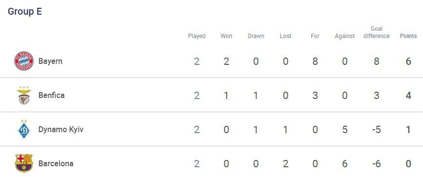 У турнірній таблиці після двох турів кияни посідають третє місце, маючи в активі одне очко. Зі 100-відсотковим показником лідирує "Баварія" – два матчі й дві перемоги.