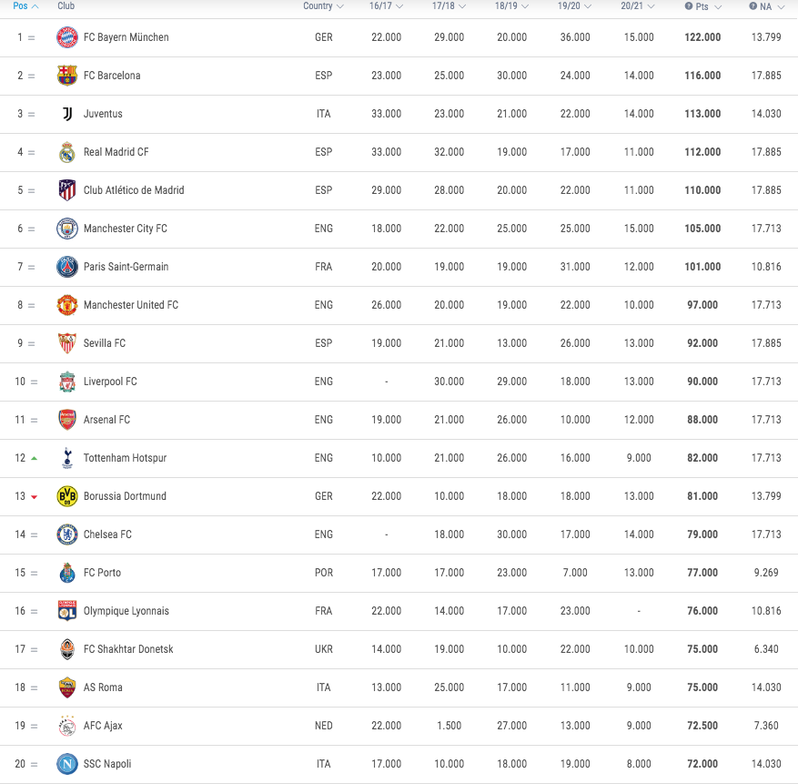 Зокрема, "Шахтар", як і минулоріч, посідає 17-те місце із 75 балами. Це найвища позиція серед українських команд. Київське "Динамо" – на 31-му місці із 44 балами, луганська "Зоря" – на 98-му, "Десна" і "Колос" ділять 175-те місце, на 177–179 позиціях розташувалися "Олександрія", "Маріуполь" і "Ворскла" відповідно.