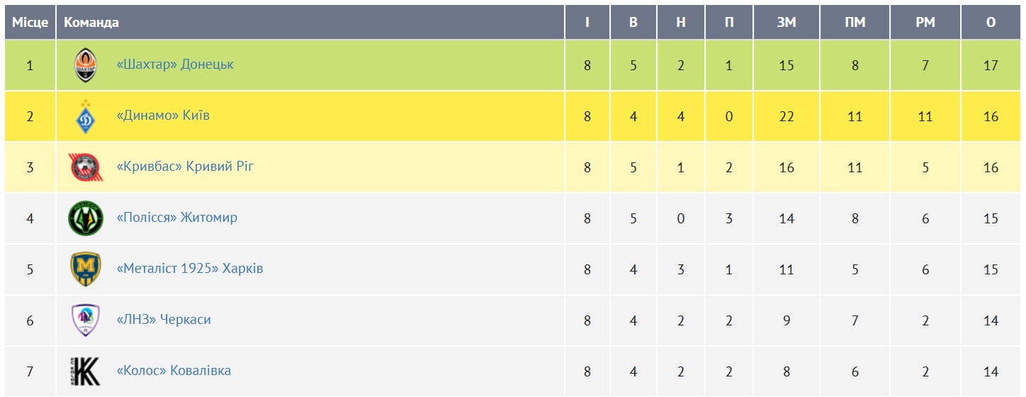 За підсумками восьми турів "Шахтар" залишився лідером УПЛ, але відрив від київського "Динамо", який іде за ним, (сьогодні клуб зіграв 1:1 із харківським "Металістом-1925") скоротився до одного очка.