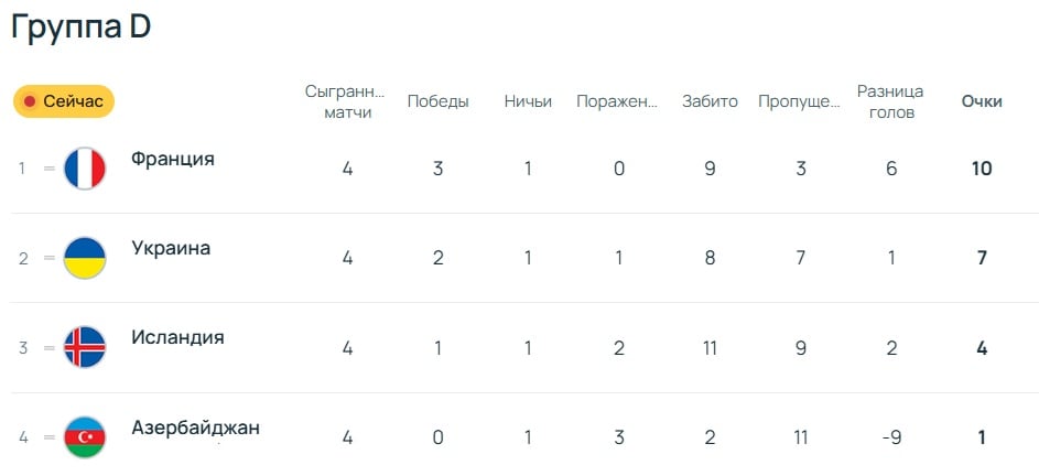 У турнірній таблиці групи D Україна зараз посідає друге місце, відстаючи від лідера, Франції, на три очки.
