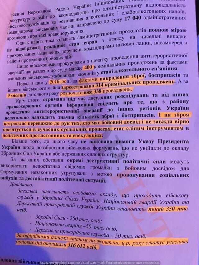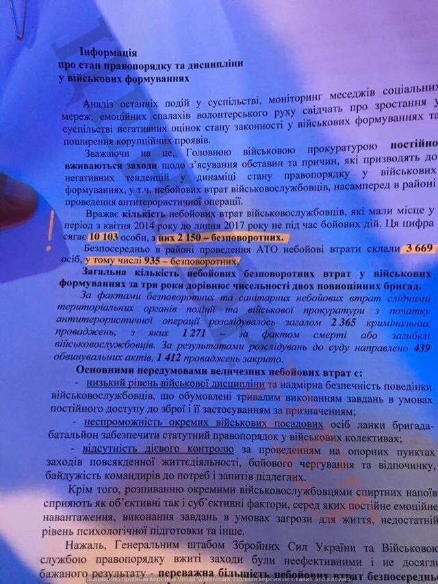 Із квітня 2014 року до липня 2017 року кількість небойових утрат серед українських військовослужбовців становила 10 103 особи, із яких 2150 – безповоротні. Про це йдеться в документі Головної військової прокуратури України, який оприлюднило видання "Цензор.НЕТ".