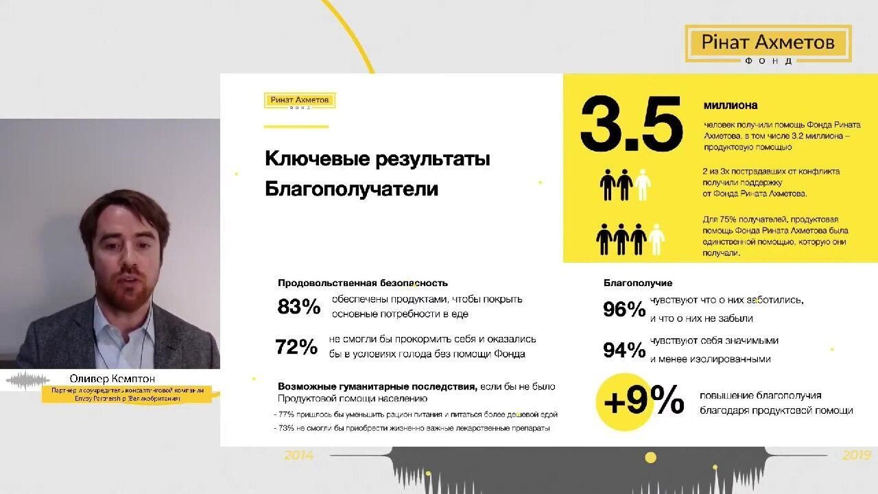 Дослідження проводили за шість етапів, воно тривало кілька місяців. Олівер Кемптон поділився деякими головними висновками зі звіту, підготовленого за результатами дослідження. Зокрема, з'ясували, що допомогу Фонду Ріната Ахметова загалом отримало 3,5 млн осіб, зокрема 3,2 млн – продуктову допомогу. Сюди входять прямі отримувачі допомоги і ті, з ким вони ділилися їжею.
