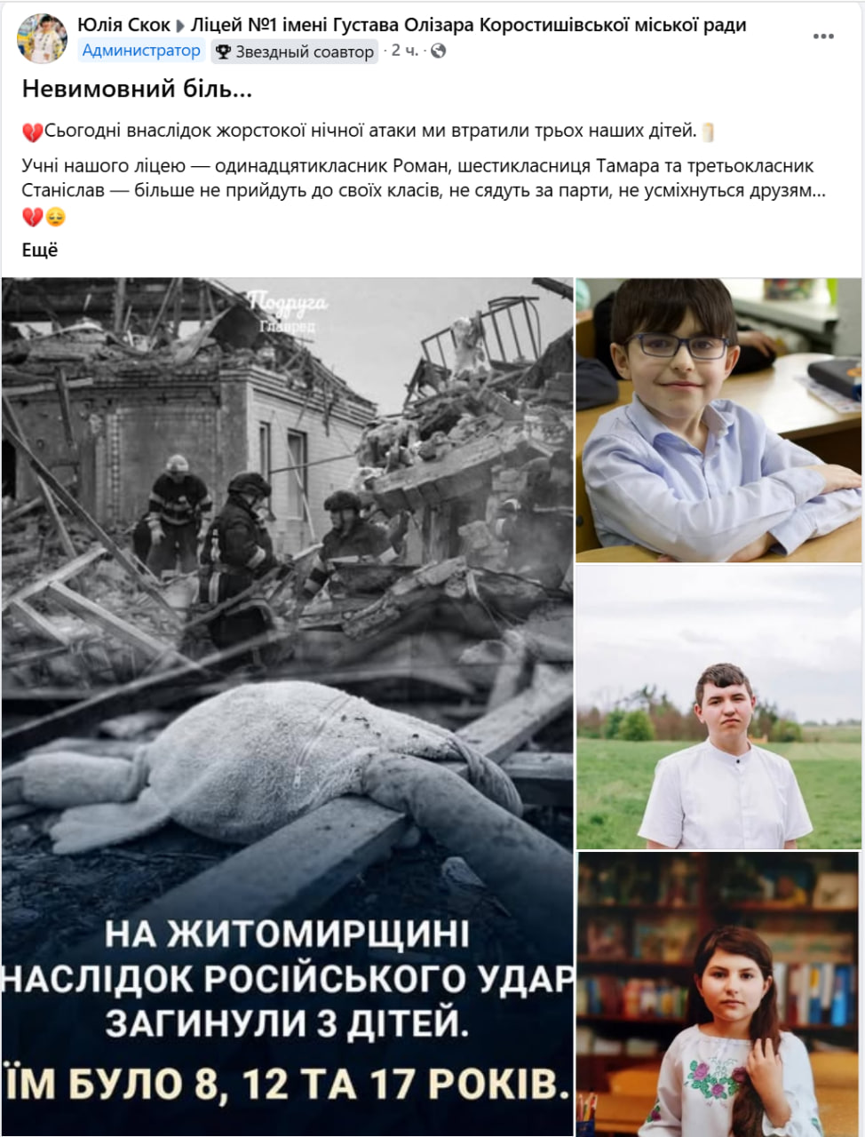 "Сьогодні внаслідок жорстокої нічної атаки ми втратили трьох наших дітей. Учні нашого ліцею – 11-класник Роман, шестикласниця Тамара і третьокласник Станіслав – більше не прийдуть до своїх класів, не сядуть за парти, не усміхнуться друзям… У Роми через лічені дні мав бути випускний – день, якого він чекав із надією та мріями. А в його молодших брата й сестри попереду було ще стільки перших дзвінків, екскурсій, свят, відкриттів, щасливих моментів дитинства… Але все це обірвала війна. Нам болить. Усій шкільній родині", – ідеться в дописі.