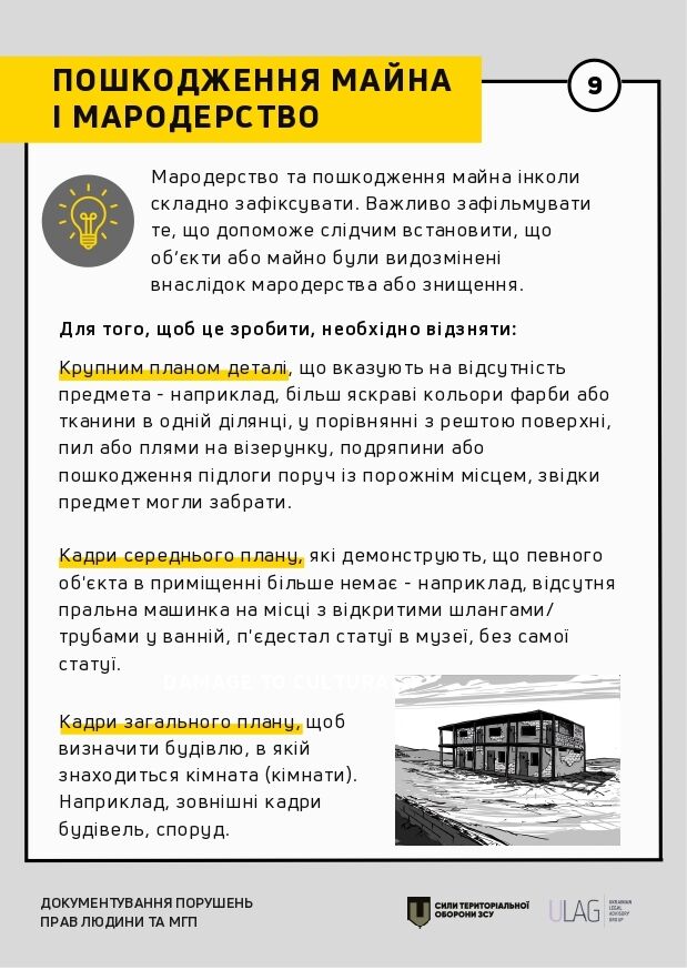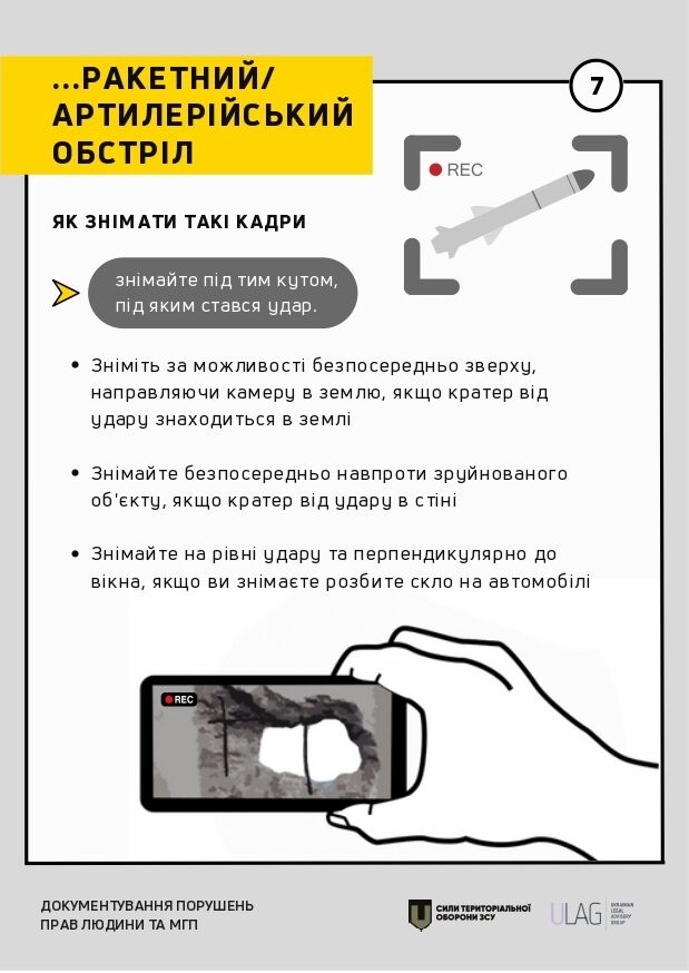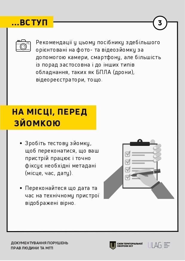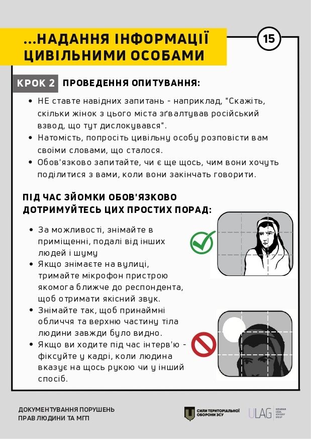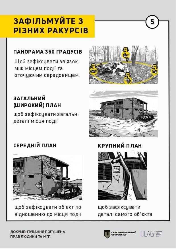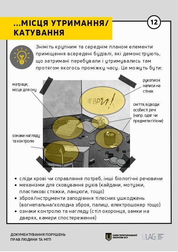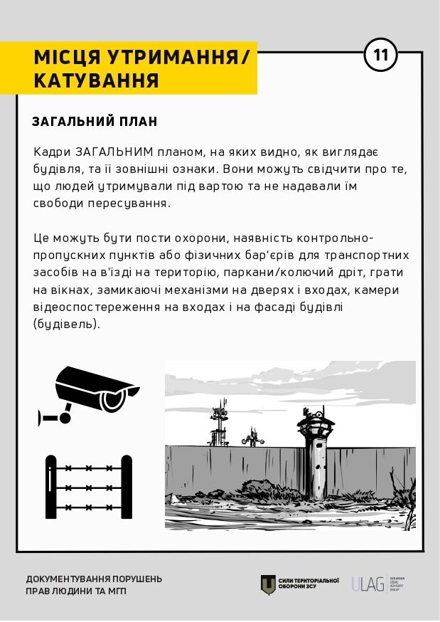 Інструкція містить практичні рекомендації щодо документування відповідно до міжнародних стандартів. Ідеться про те, як документувати за допомогою відеозйомки, проведення базового опитування, а також на яку саме інформацію насамперед звертати увагу в окремих сценаріях (обстріли, місця тримання, катування тощо).