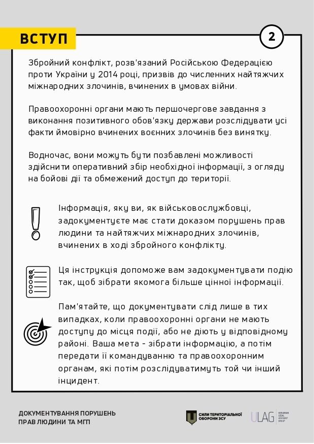 Для військовослужбовців Сил територіальної оборони ЗСУ створили ілюстровану інструкцію документування порушень прав людини й норм міжнародного гуманітарного права. Її опублікували 25 серпня на порталі Sprotyv G7.