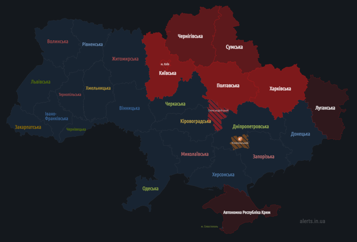 Повітряну тривогу увечері 23 березня оголосили у Києві, Київській, Чернігівській, Сумській, Полтавській, Харківській, частині Кіровоградської областей. Також зберігається тривога, яку раніше оголосили в Луганській області та в Криму.