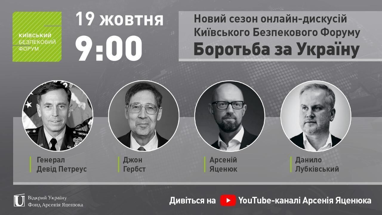 19 жовтня Київський безпековий форум, заснований фондом прем'єр-міністра України у 2014–2016 роках Арсенія Яценюка Open Ukraine, проведе онлайн-дискусію, якою розпочне новий сезон дискусій воєнного циклу "Боротьба за Україну".