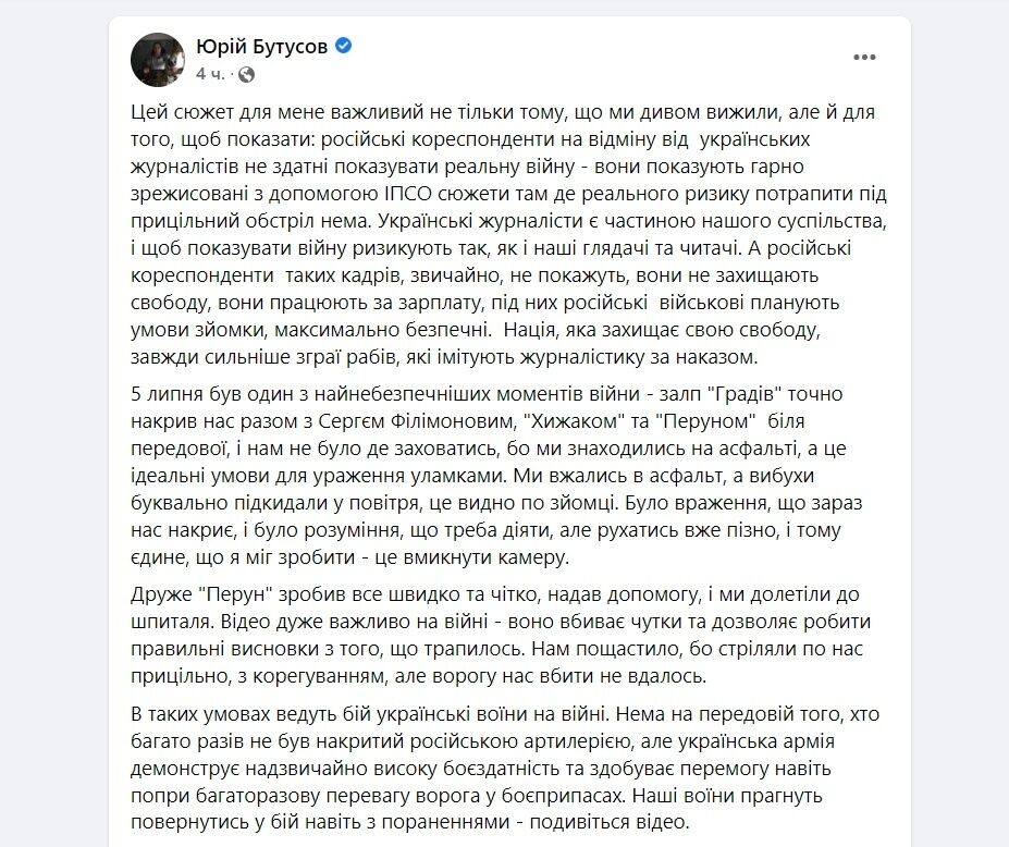 "Цей сюжет для мене важливий не тільки тому, що ми дивом вижили, але й для того, щоб показати: російські кореспонденти, на відміну від українських журналістів, не здатні показувати реальну війну – вони показують гарно зрежисовані за допомогою ІПСО сюжети, там, де реального ризику потрапити під прицільний обстріл немає", – додав Бутусов.