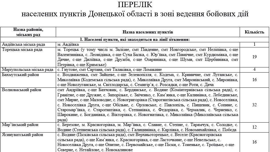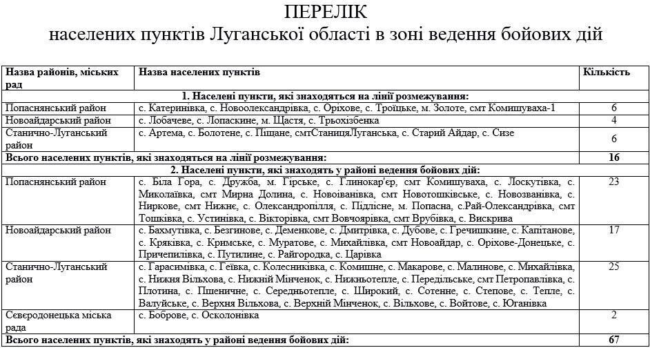 Волонтер Роман Доник опублікував у Facebook перелік населених пунктів Донецької і Луганської областей, які входять в зону бойових дій у відповідності з новими правилами у зв'язку з початком проведення операції Об'єднаних сил (ООС).
