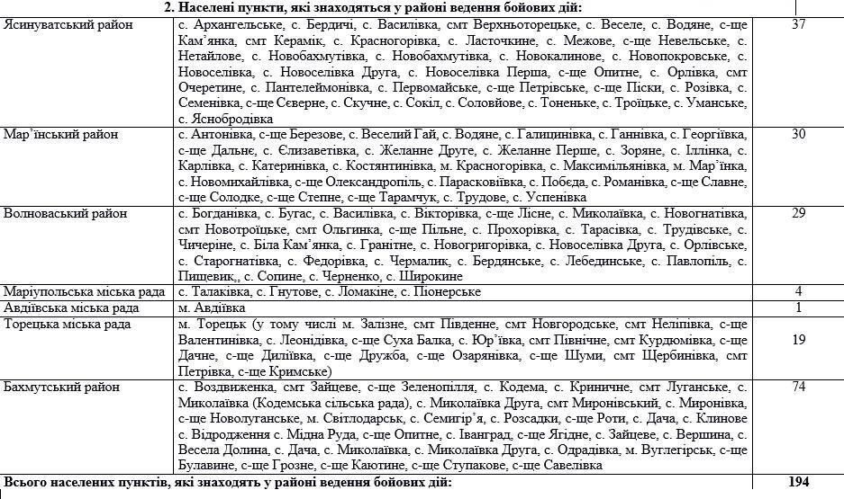 "Зоною безпеки, прилеглій до району бойових дій, вважається: Виноградне, Курахове, Очеретине, Розівка, Волчеяровка, Біла Гора, Новоайдар, Садки, Макарівка, Простяное, уздовж державного кордону урочищі Чернявка, уздовж адміністративного кордону Луганської та Харківської областей Ольговка, уздовж адміністративного кордону Донецької та Харківської областей Знаменівка, уздовж адміністративного кордону Донецької та Дніпропетровської областей Комишуваха, уздовж адміністративної межі Донецької і Запорізької областей Урзуф, уздовж морського узбережжя Приморське", – розповіли в прес-центрі.