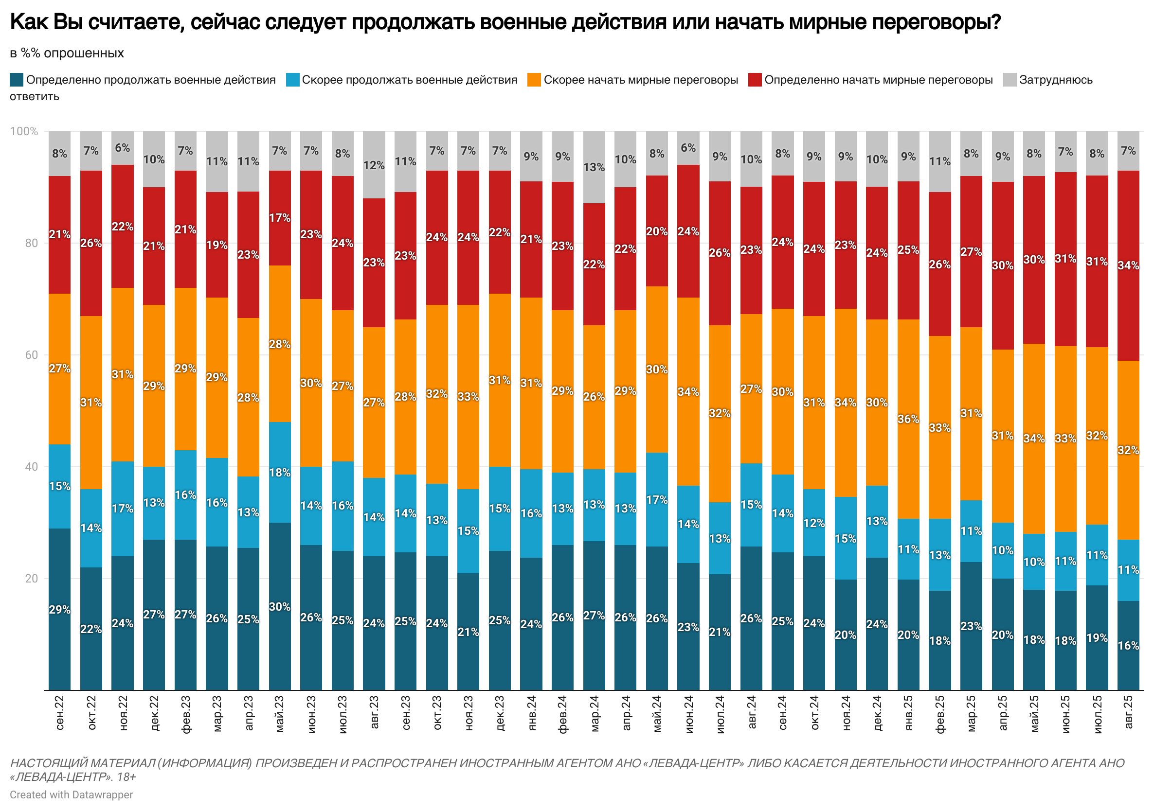 Раніше найменшу підтримку війни з боку росіян фіксували у травні 2025 року: 64% виступали за мирні переговори і 19% – за бойові дії.