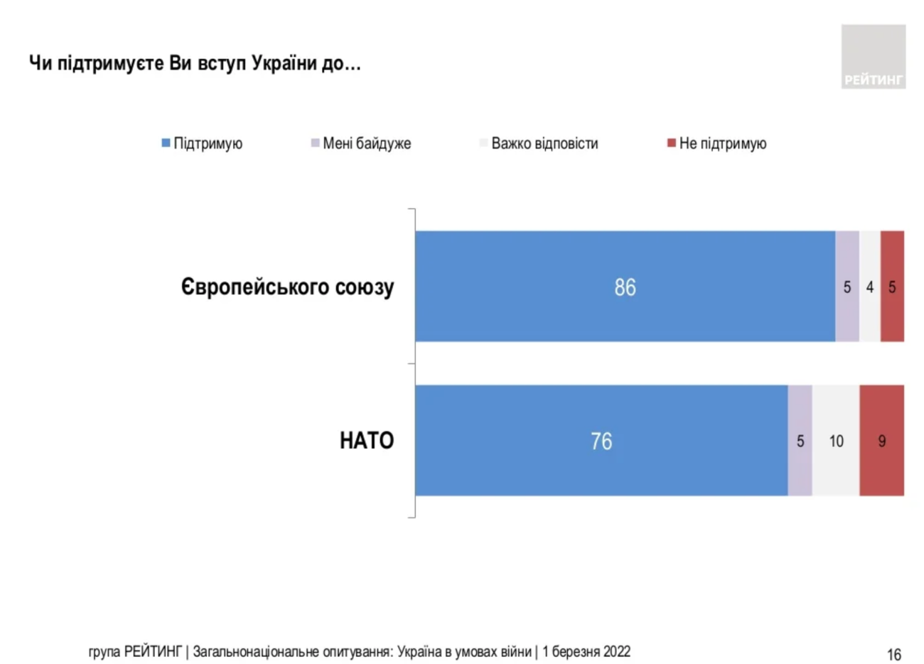 "Підтримка вступу України до Європейського союзу та НАТО найвища за всю історію опитувань: 86% підтримують приєднання України до ЄС, 76% – за вступ в НАТО. У порівнянні з довоєнним періодом рівень підтримки вступу до ЄС та НАТО зріс більше ніж на 20%”, – повідомляють у релізі.